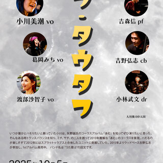 10月05日(日) フ・タウタフ@渋谷・公園通りクラシックス 三人の女性による心地よい歌声と三人のおじさんのフ・タウタフ渋谷のクラシックスでのライブはあと2回!お見逃しなくどうぞよろしくです。 小川美潮(vo) 葛岡みち(vo) 渡部沙智子(vo)吉森 信(pf) 吉野弘志(b)小林武文(dr)19時open19時半startチャージ:予約¥3,500/ 当日¥4,000 公園通りクラシックス 前の記事 次の記事